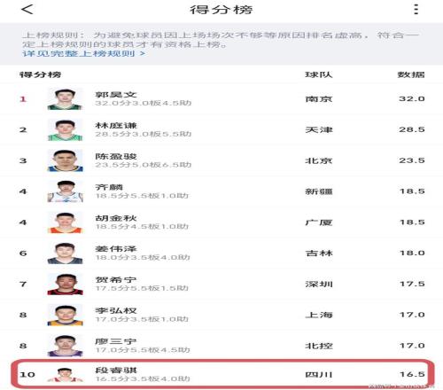 首戰(zhàn)打廣州隊一役,段睿騏出場24分鐘,拿到13分3板3助3斷;上輪比賽客場打青島隊,段睿騏出戰(zhàn)27分鐘,投籃13中7,三分球2中1,罰球6中5,拿到20分6籃板5助攻1搶斷的數(shù)據(jù)。截止目前,段睿騏的個人得分和助攻,都是全隊最高的,是四川隊的“得分王”和“助攻王”。
